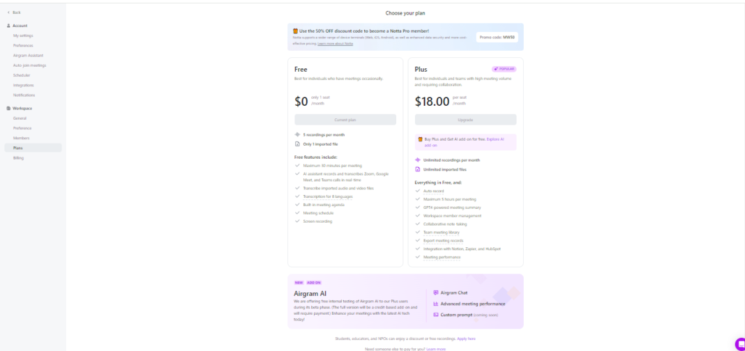 Airgram offers both free and premium plans. The free plan includes basic features and limited usage, while the premium plan offers additional features and unlimited usage($18.00 per seat/month).